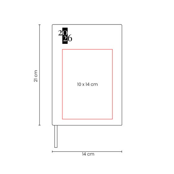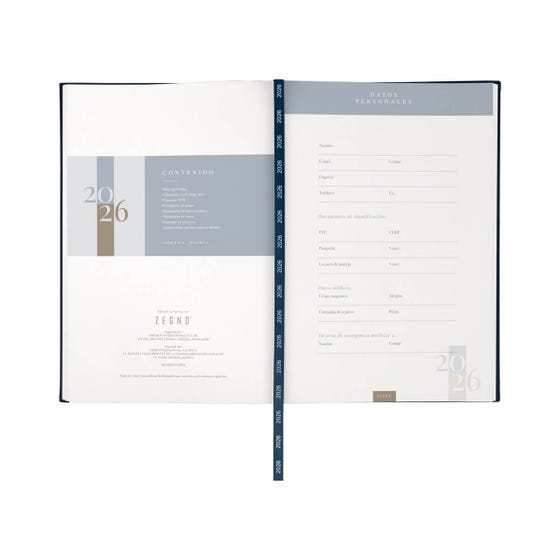 Agenda diaria con 186 hojas. Contiene datos personales, calendarios 2025-2026-2027, planeador 2026, presupuesto de gastos, seguimiento de nuevos hábitos, organizador de tareas, planeador de proyectos y días festivos. Incluye caja individual.